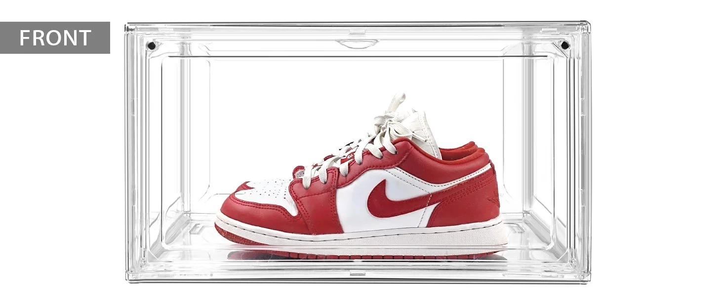 The shoe cabinet is 14.2” L * 10.6” W * 8” H, each shoe box is big enough to hold up to Men’s 15/Women’s 12, no need to put it horizontally. Can hold AJ, sneakers, high tops, all high heels, booties, provide more flexibility in shoe size. The sneaker storage box is much stronger than you might think, each panel is made of thickened high hardness PET acrylic production.